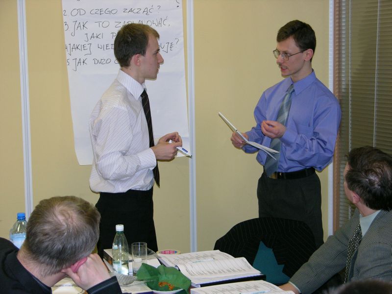 Ostatnie uzgodnienia przed prezentacją wyników pracy grupowej. Rozmawiają Marcin Franczak (z lewej) oraz Michał Bednarski.